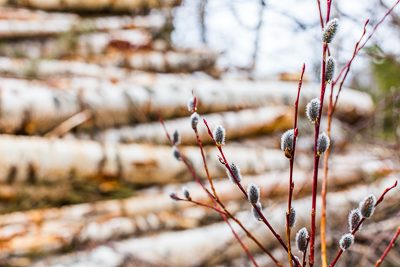 Ponnistelen ojasta ylös, ja nousen takaisin pyöräni selkään.Tie tästä seuraavaan kohteeseen näyttäisi olevan hyvässä kunnossa. Tovin poljettuani pysähdynkin metsää vasten makaavan korkean puupinon luokse, joka koostuu koivurungoista. Pienen matkan päässä nököttää punainen auto. Seurailessani jonkin perhosen lentelyä huomaan miehen kävelevän pellon laitaa raivaussaha kädessä autoaan kohden. Loikkaan ojan yli metsän puolelle. Tarkestellessani pajunkissoja näkemäni auto valuu hiljakseen kohdalleni, ja siitä samantien eteenpäin.